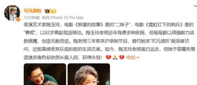 娱乐圈明星纷纷发文悼念,主持人曹可凡爆料,表示陶玉玲老师近年身患多种疾病,但每每都以顽强毅力战胜病魔,创造无数奇迹。陶老师三年前还录制了他的节目“可凡倾听”,本人乐观积极。