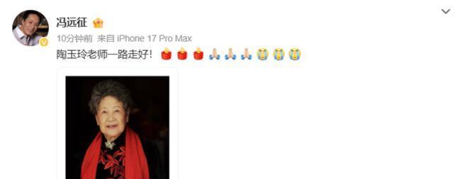 演员冯远征则祝福陶老师一路走好,并配上了哭泣表情。据悉,冯远征跟陶老师曾多次在文艺活动和演出中合作,比如2020年北京市文联举办的“百花迎春”联欢会上,两人共同参与了诗朗诵《你听》,还在2022年春晚的开场节目《欢乐吉祥年》中,冯远征与陶老师同台表演,可以说十分熟悉。