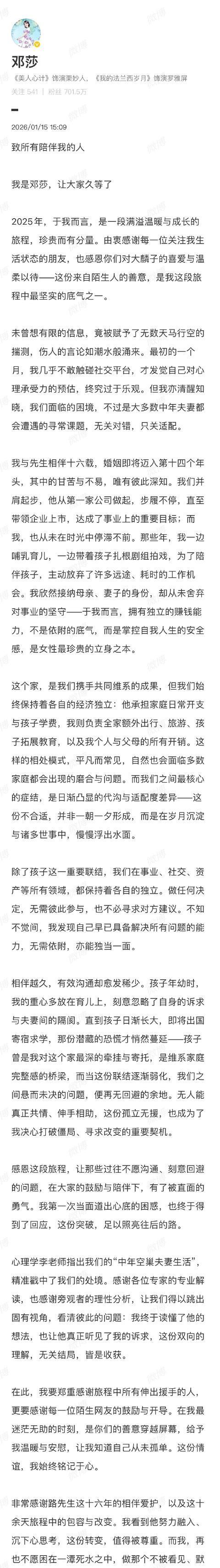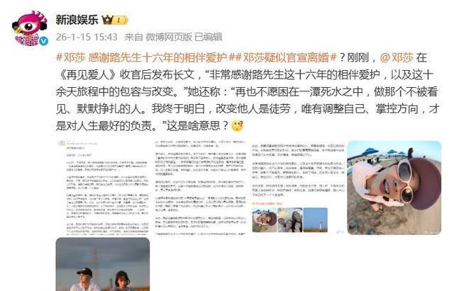 从“豪门媳妇”标签到凭借综艺展现真实自我,再到如今果断挥别过去,邓莎的路径勾勒出一个女性从被定义到自我定义的转变。网友感慨:“她终于把‘妻子’和‘母亲’的角色还给了对方,把‘自己’还给了自己。”这场平静的官宣,没有指责,却比任何控诉都更有力量。它宣告的是:婚姻不是僵局的庇护所,40岁,也可以是重启人生的开始。